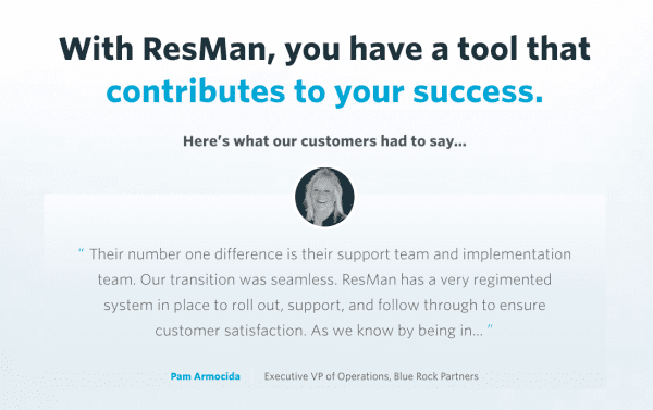 We have also helped our clients incorporate customer testimonials on their websites as well. (See below for an example from property management software provider ResMan.)