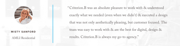 At Criterion.B, many of our current clients are from word-of-mouth referrals. As a smaller marketing and branding agency, establishing and maintaining an honest brand is something our team prioritizes not only for ourselves but for our clients. This is why we designed an entire page on our website dedicated to case studies and customer testimonials.